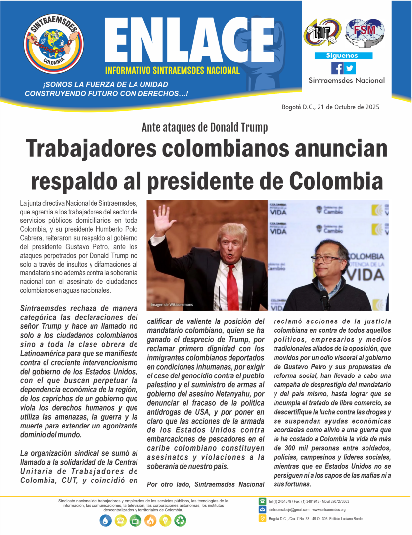 La organización sindical se sumó al llamado a la solidaridad de la Central Unitaria de Trabajadores de Colombia, CUT, y coincidió en calificar de valiente la posición del mandatario colombiano, quien se ha ganado el desprecio de Trump, por reclamar primero dignidad con los inmigrantes colombianos deportados en condiciones inhumanas, por exigir el cese del genocidio contra el pueblo palestino y el suministro de armas al gobierno del asesino Netanyahu, por denunciar el fracaso de la política antidrogas de USA, y por poner en claro que las acciones de la armada de los Estados Unidos contra embarcaciones de pescadores en el caribe colombiano constituyen asesinatos y violaciones a la soberanía de nuestro país.