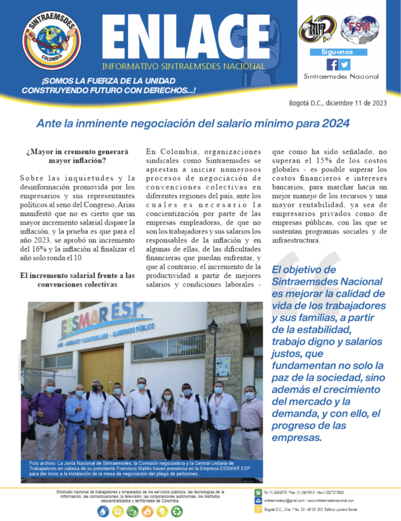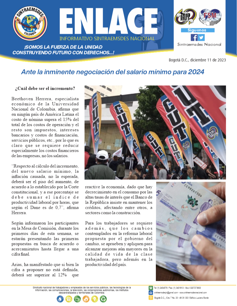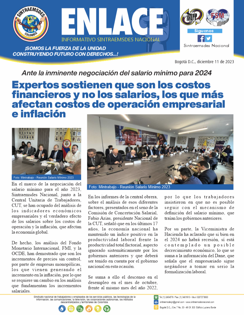 En el marco de la negociación del salario mínimo para el año 2023, Sintraemsdes Nacional, junto a la Central Unitaria de Trabajadores, CUT, se han ocupado del análisis de los indicadores económicos empresariales y el verdadero efecto de los salarios sobre los costos de operación y la inflación, que afectan la economía global.