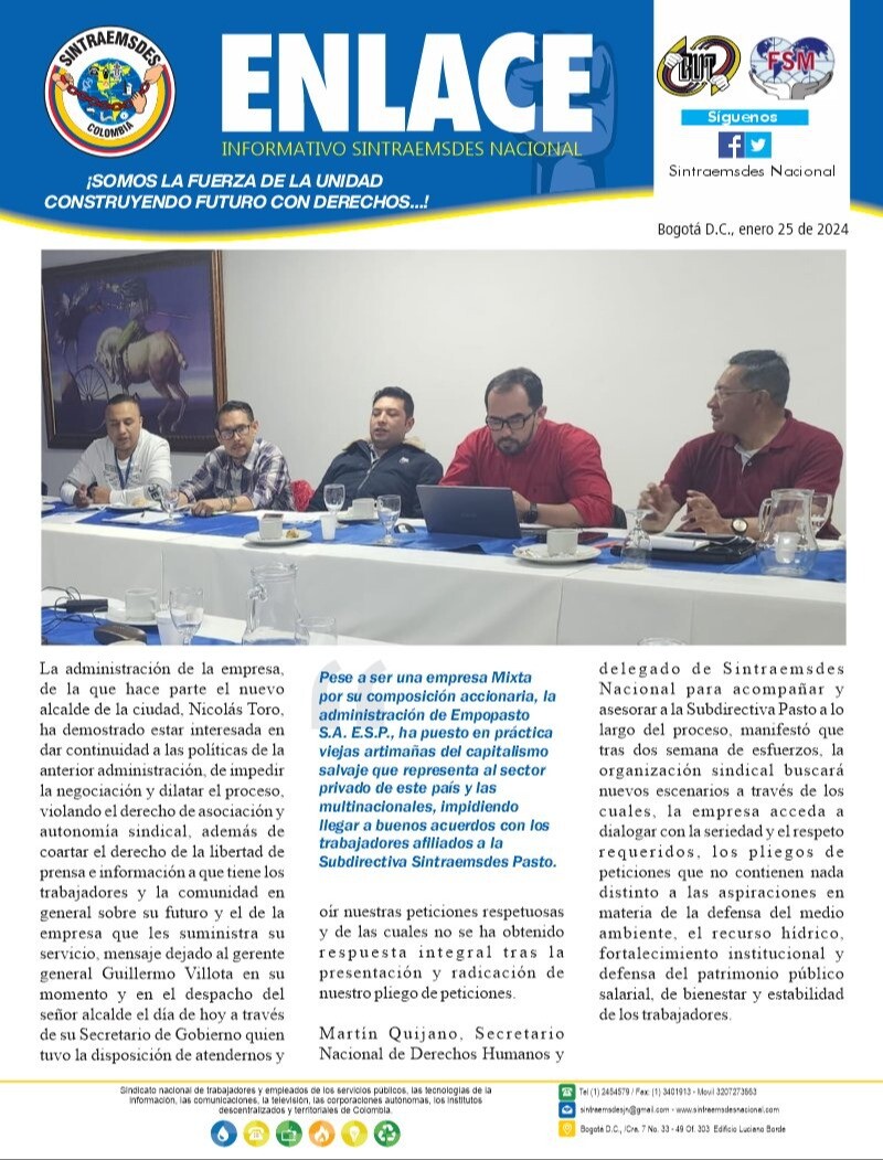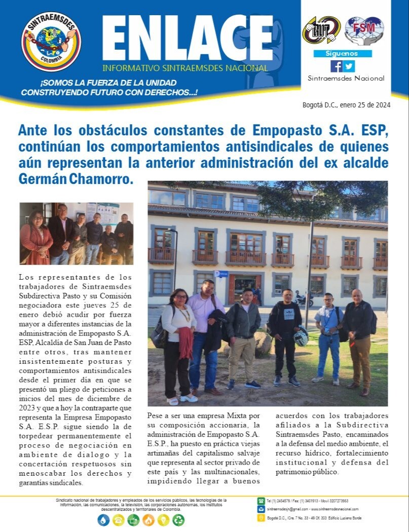 Los representantes de los trabajadores de Sintraemsdes Subdirectiva Pasto y su Comisión negociadora este jueves 25 de enero debió acudir por fuerza mayor a diferentes instancias de la administración de Empopasto S.A. ESP, Alcaldía de San Juan de Pasto entre otros, tras mantener insistentemente posturas y comportamientos antisindicales desde el primer día en que se presentó un pliego de peticiones a inicios del mes de diciembre de 2023 y que a hoy la contraparte que representa la Empresa Empopasto S.A. E.S.P. sigue siendo la de torpedear permanentemente el proceso de negociación en ambiente de dialogo y la concertación respetuosos sin menoscabar los derechos y garantías sindicales.
