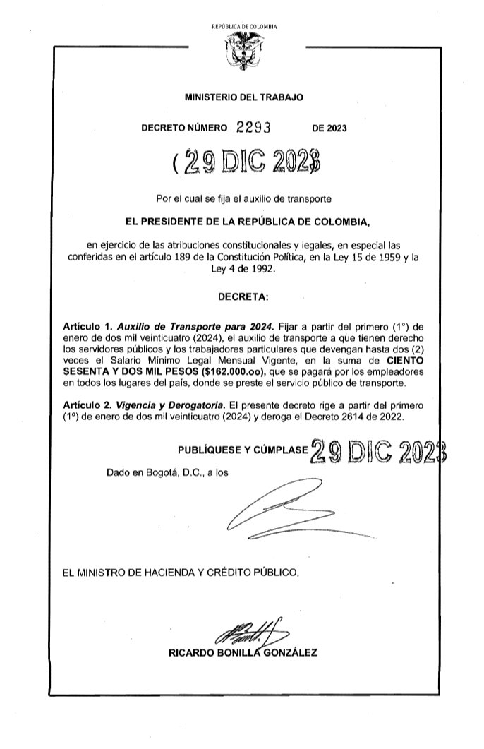 Auxilio de transporte 2024 DECRETO 2293 DEL 29 DE DICIEMBRE DE 2023