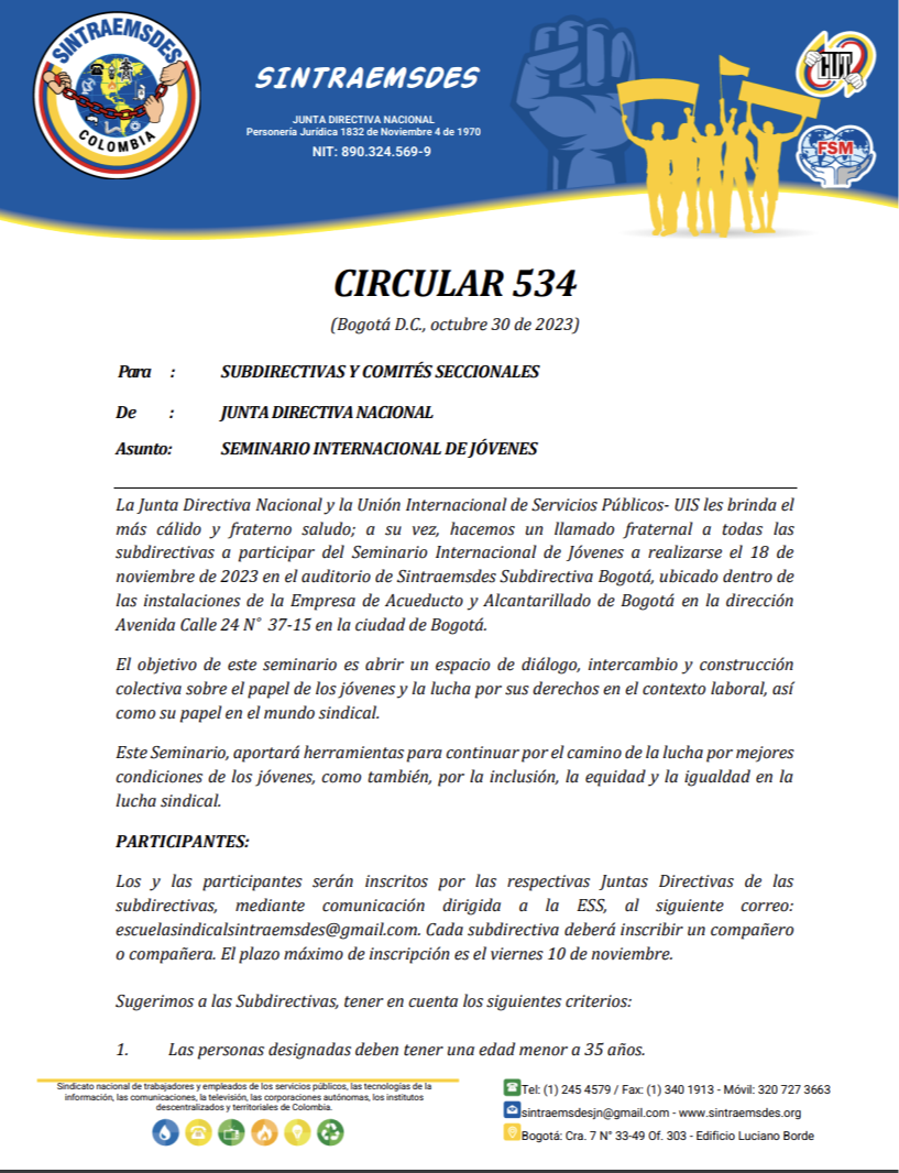 La Junta Directiva Nacional y la Unión Internacional de Servicios Públicos- UIS les brinda el más cálido y fraterno saludo; a su vez, hacemos un llamado fraternal a todas las subdirectivas a participar del Seminario Internacional de Jóvenes a realizarse el 18 de noviembre de 2023 en el auditorio de Sintraemsdes Subdirectiva Bogotá, ubicado dentro de las instalaciones de la Empresa de Acueducto y Alcantarillado de Bogotá en la dirección Avenida Calle 24 N° 37-15 en la ciudad de Bogotá.