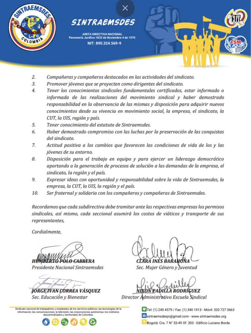 Recordamos que cada subdirectiva debe tramitar ante las respectivas empresas los permisos sindicales, así mismo, cada seccional asumirá los costos de viáticos y transporte de sus representantes.