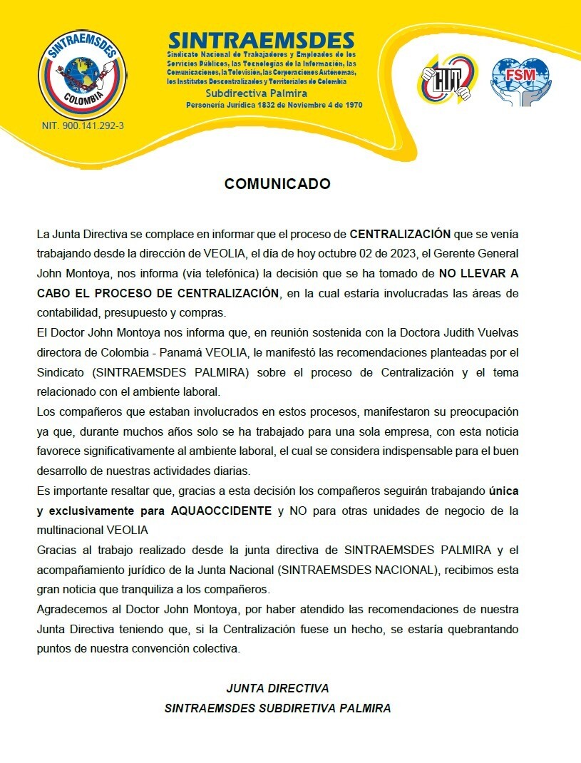 Roosebelth Galarza, presidente de la Subdirectiva, informó que en conversación sostenida este lunes 2 de octubre, con John Montoya, Gerente General de Aquaoccidente, le fue informada la decisión de la Regional Colombia - Panamá de la multinacional Veolia, de no aplicar el anunciado proceso de centralización regional, en las áreas de contabilidad y almacén.