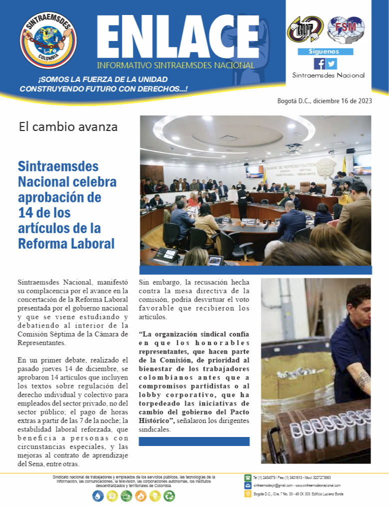 Sintraemsdes Nacional, manifestó su complacencia por el avance en la concertación de la Reforma Laboral presentada por el gobierno nacional y que se viene estudiando y debatiendo al interior de la Comisión Séptima de la Cámara de Representantes.