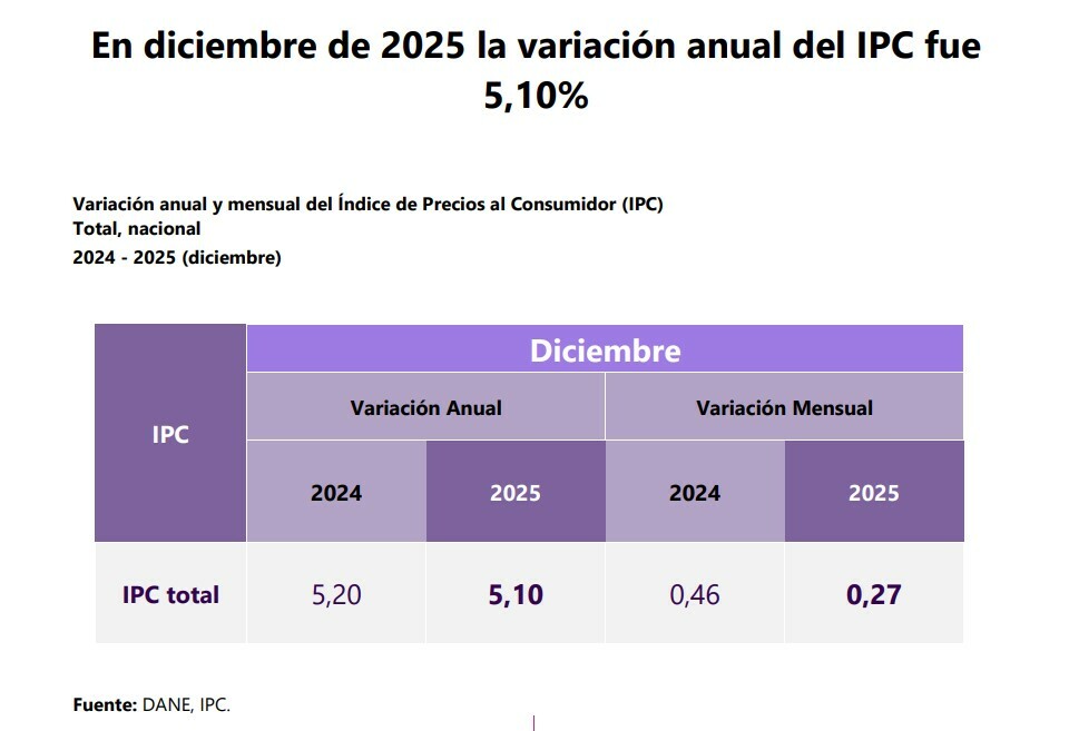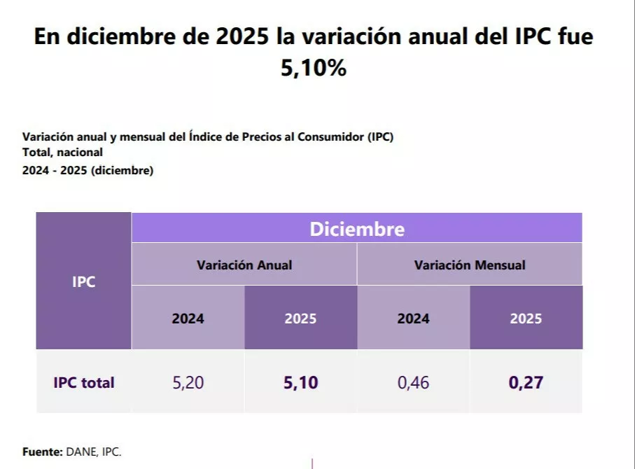 En diciembre de 2025 la variación anual del IPC fue 5,10%. El comportamiento anual del IPC total en diciembre de 2025 (5,10%) se explicó principalmente por la variación anual de las divisiones Alojamiento, agua, electricidad, gas y otros combustibles y Alimentos y bebidas no alcohólicas.