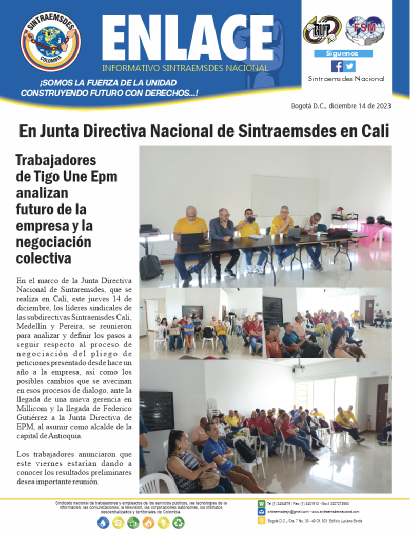 En el marco de la Junta Directiva Nacional de Sintaremsdes, que se realiza en Cali, este jueves 14 de diciembre, los líderes sindicales de las subdirectivas Sintraemsdes Cali, Medellín y Pereira, se reunieron para analizar y definir los pasos a seguir respecto al proceso de negociación del pliego de peticiones presentado desde hace un año a la empresa, así como los posibles cambios que se avecinan en esos procesos de dialogo, ante la llegada de una nueva gerencia en Millicom y la llegada de Federico Gutiérrez a la Junta Directiva de EPM, al asumir como alcalde de la capital de Antioquia.