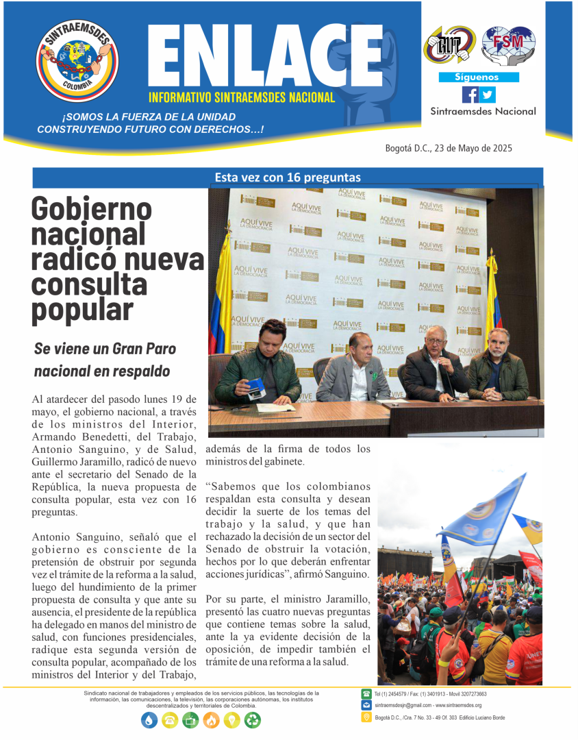 Al atardecer del pasodo lunes 19 de mayo, el gobierno nacional, a través de los ministros del Interior, Armando Benedetti, del Trabajo, Antonio Sanguino, y de Salud, Guillermo Jaramillo, radicó de nuevo ante el secretario del Senado de la República, la nueva propuesta de consulta popular, esta vez con 16 preguntas.