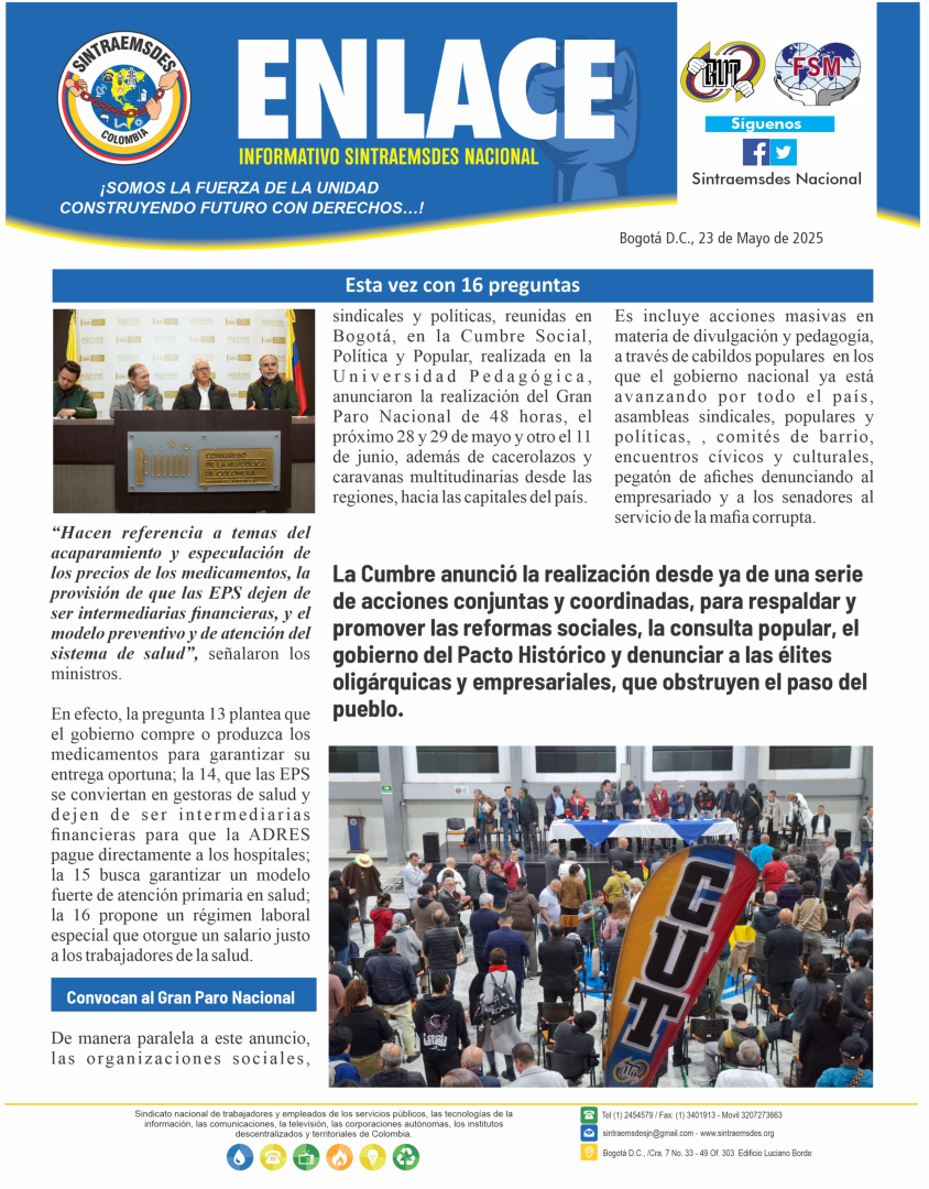 La Cumbre anunció la realización desde ya de una serie de acciones conjuntas y coordinadas, para respaldar y promover las reformas sociales, la consulta popular, el gobierno del Pacto Histórico y denunciar a las élites oligárquicas y empresariales, que obstruyen el paso del pueblo.