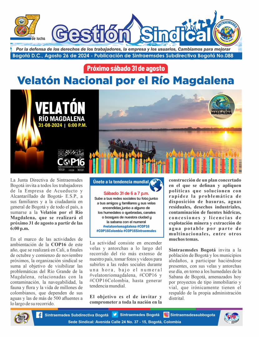 La Junta Directiva de Sintraemsdes Bogotá invita a todos los trabajadores de la Empresa de Acueducto y Alcantarillado de Bogotá- E.S.P., a sus familiares y a la ciudadanía en general de Bogotá y de todo el país, a sumarse a la Velatón por el Río Magdalena, que se realizará el próximo 31 de agosto a partir de las 6:00 p.m.