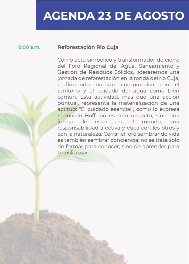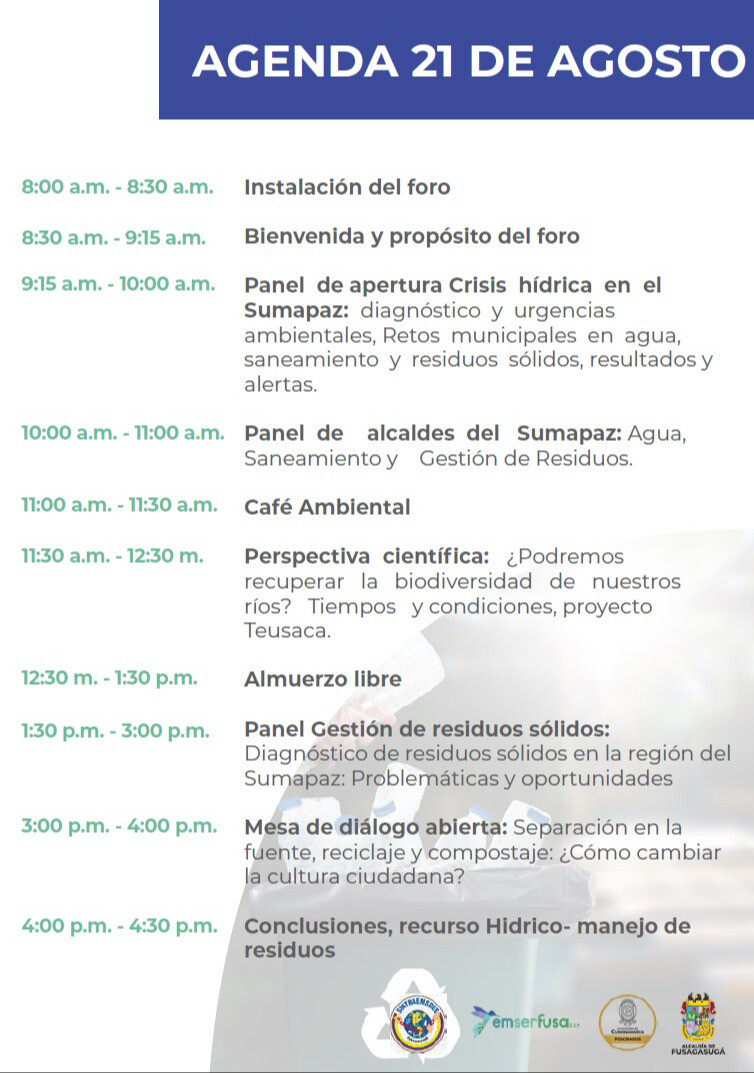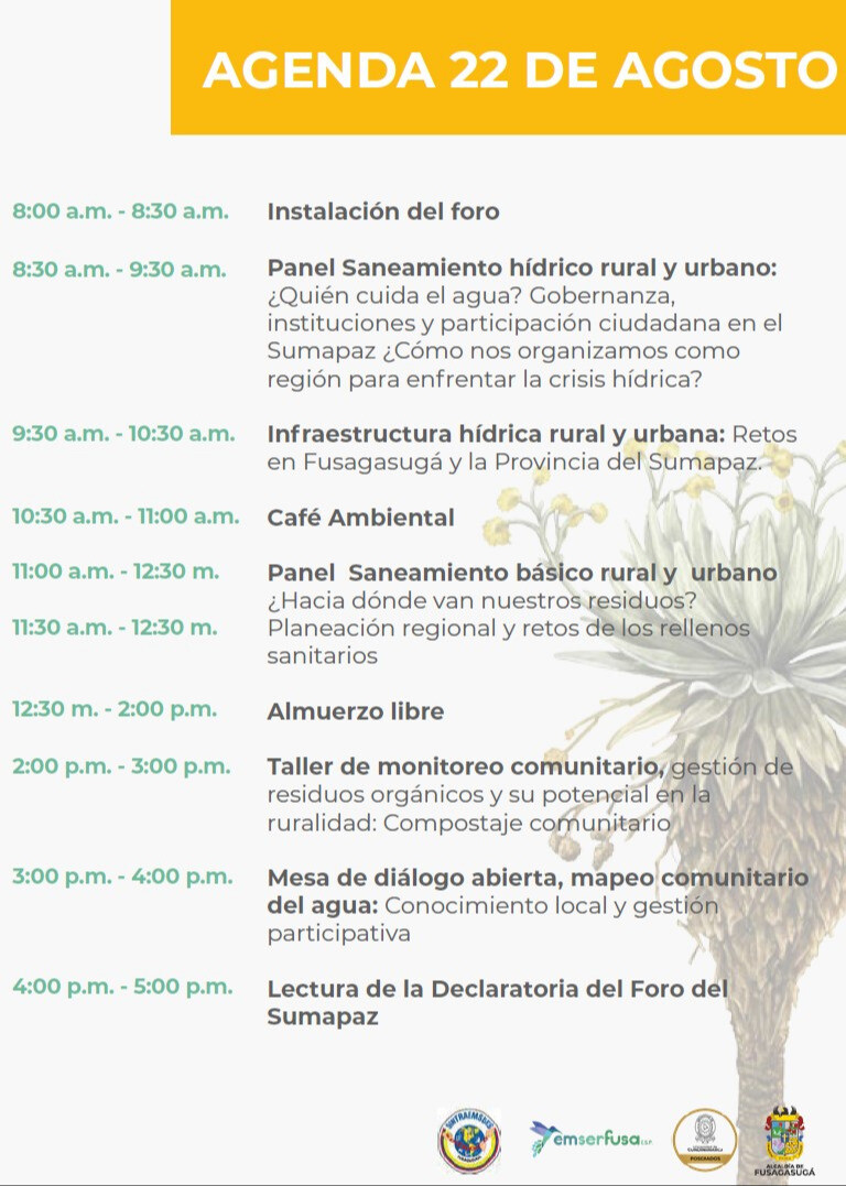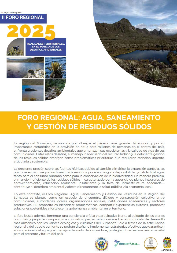 En este contexto, el Foro Regional Agua, Saneamiento y Gestión de Residuos en la Región del Sumapaz se plantea como un espacio de encuentro, diálogo y construcción colectiva entre comunidades, autoridades locales, organizaciones sociales, instituciones académicas y sectores productivos. Su propósito es identificar problemáticas, compartir experiencias exitosas, promover soluciones sostenibles y fortalecer la gobernanza ambiental en el territorio.