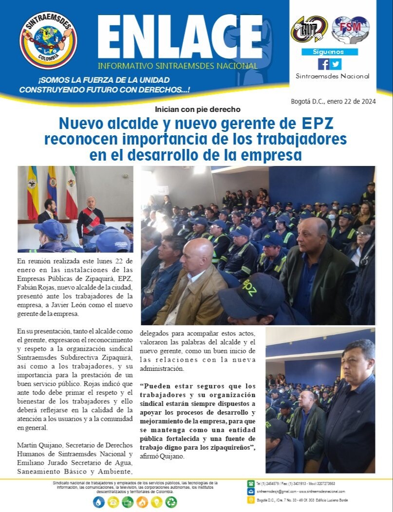 “Pueden estar seguros que los trabajadores y su organización sindical estarán siempre dispuestos a apoyar los procesos de desarrollo y mejoramiento de la empresa, para que se mantenga como una entidad pública fortalecida y una fuente de trabajo digno para los zipaquireños”, afirmó Quijano.