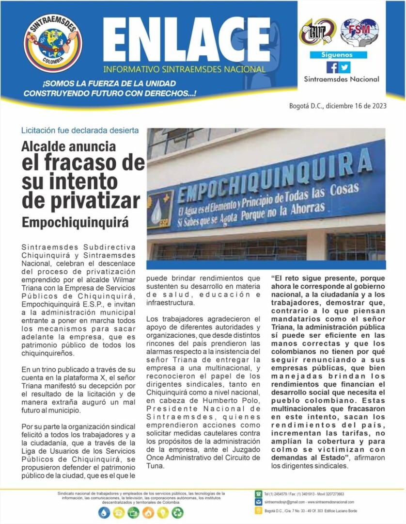 Sintraemsdes Subdirectiva Chiquinquirá y Sintraemsdes Nacional, celebran el descenlace del proceso de privatización emprendido por el alcalde Wilmar Triana con la Empresa de Servicios Públicos de Chiquinquirá, Empochiquinquirá E.S.P., e invitan a la administración municipal entrante a poner en marcha todos los mecanismos para sacar adelante la empresa, que es patrimonio público de todos los chiquinquireños.