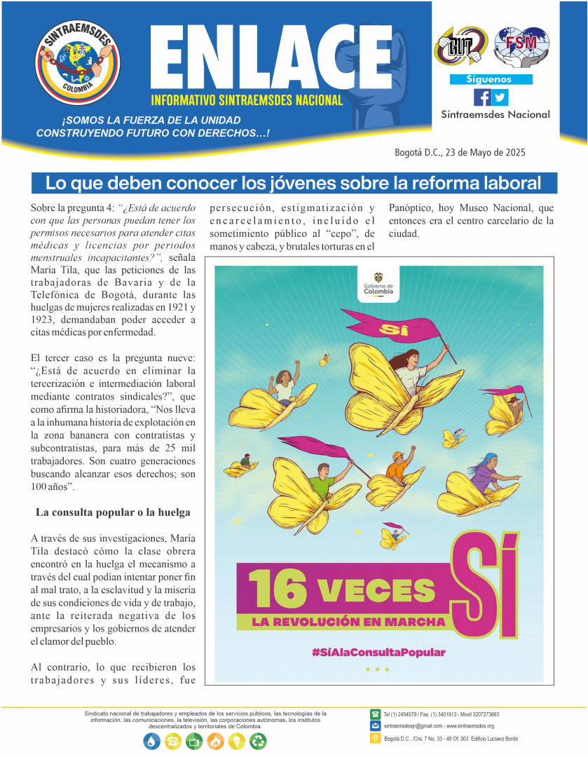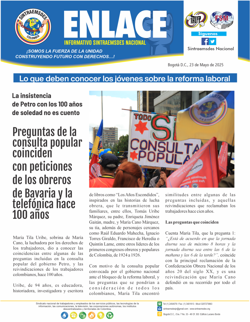 Con motivo de la consulta popular convocada por el gobierno nacional ante el bloqueo de la reforma laboral, y las preguntas que se pondrían a consideración de todos los colombianos, María Tila encontró similitudes entre algunas de las preguntas incluidas, y aquellas reivindicaciones que reclamaban los trabajadores hace cien años.