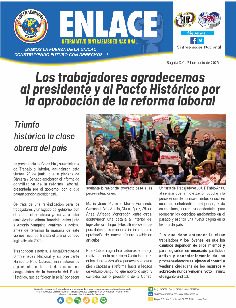 Tras conocer la noticia, la Junta Directiva de Sintraemsdes Nacional y su presidente Humberto Polo Cabrera, manifestaron su agradecimiento a todos aquellos congresistas de la bancada del Pacto Histórico, que se “dieron la pela” por sacar adelante lo mejor del proyecto pese a las peores situaciones.