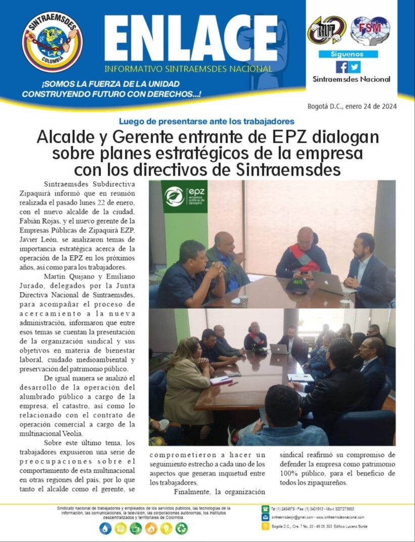 Sintraemsdes Subdirectiva Zipaquirá informó que en reunión realizada el pasado lunes 22 de enero, con el nuevo alcalde de la ciudad, Fabián Rojas, y el nuevo gerente de la Empresas Públicas de Zipaquirá EZP, Javier León, se analizaron temas de importancia estratégica acerca de la operación de la EPZ en los próximos años, así como para los trabajadores.
