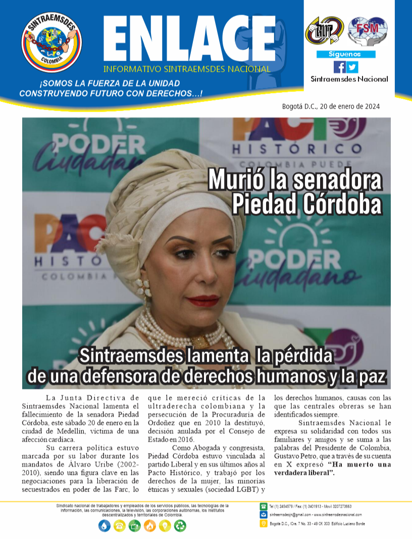 La Junta Directiva de Sintraemsdes Nacional lamenta el fallecimiento de la senadora Piedad Córdoba, este sábado 20 de enero en la ciudad de Medellín, víctima de una afección cardíaca.
