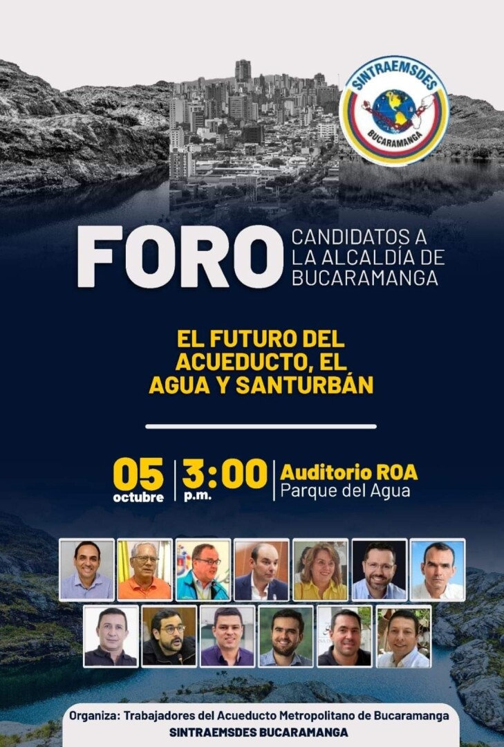 El primero de ellos se realizará en la ciudad de Bucaramanga, donde los candidatos a la alcaldía de la ciudad expondrán su posición y propuestas respecto a la defensa de la Empresa de Acueducto Metropolitano de Bucaramanga, AMB, el derecho al agua y la vida, así como la defensa del Páramo de Santurbán que abastece del líquido vital a la ciudad y la región.
