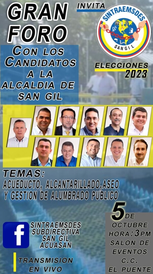 Igualmente se adelantará el Foro con los candidatos a la alcaldía del municipio de San Gil, en el que la subdirectiva pondrá de presente la importancia que tiene la empresa Acuasán en la prestación de los servicios públicos de acueducto, alcantarillado, aseo y alumbrado público, y la necesidad que el ganador de los comicios se comprometa a defender el patrimonio público y los intereses de los usuarios y ciudadanos.