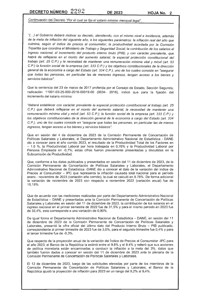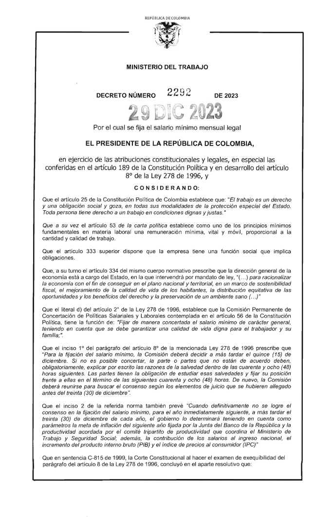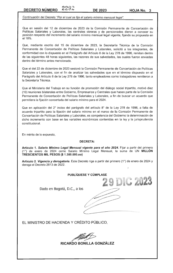 Salario Minimo Mensual Legal 2024 DECRETO 2292 DEL 29 DE DICIEMBRE DE 2023