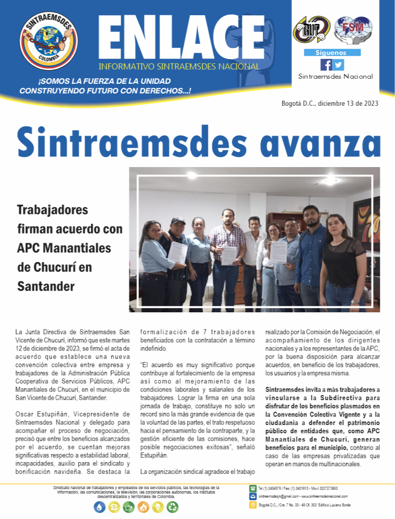La Junta Directiva de Sintraemsdes San Vicente de Chucurí, informó que este martes 12 de diciembre de 2023, se firmó el acta de acuerdo que establece una nueva convención colectiva entre empresa y trabajadores de la Administración Pública Cooperativa de Servicios Públicos, APC Manantiales de Chucurí, en el municipio de San Vicente de Chucurí, Santander.