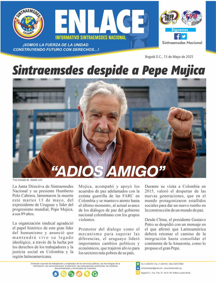 La Junta Directiva de Sintraemsdes Nacional y su presiente Humberto Polo Cabrera, lamentaron la muerte este martes 13 de mayo, del expresidente de Uruguay y líder del progresismo mundial, Pepe Mujica, a sus 89 años.