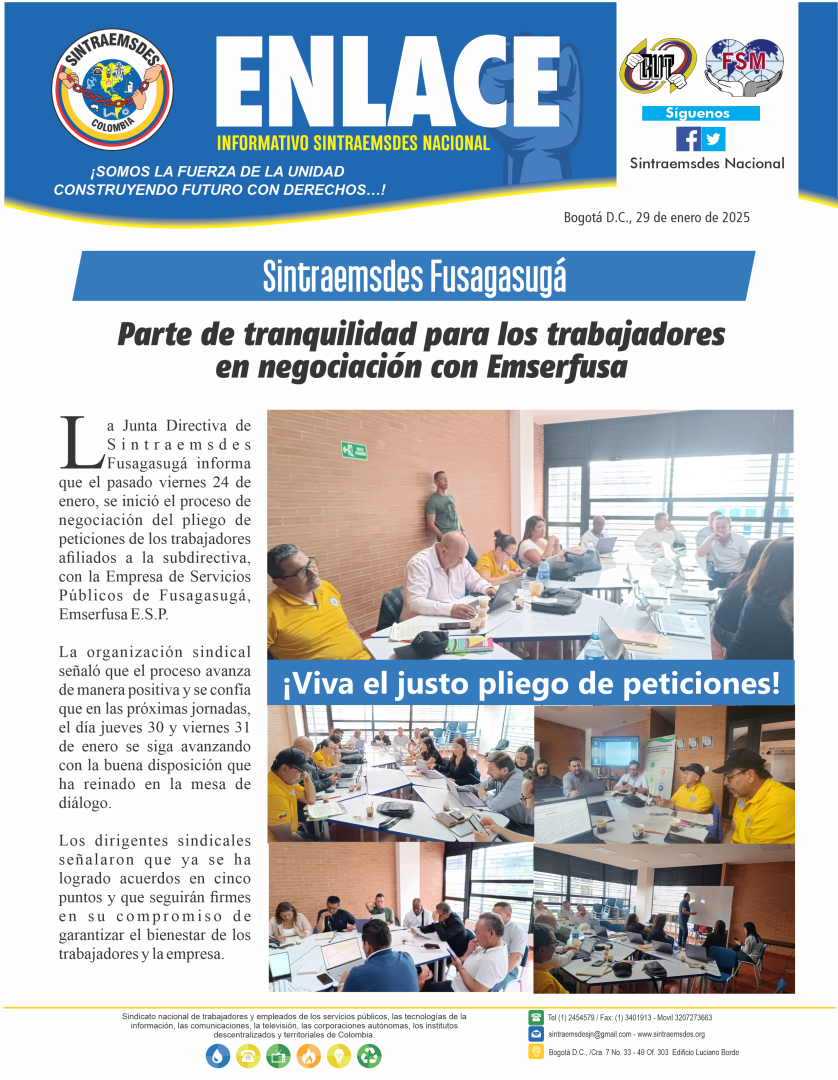 La Junta Directiva de Sintraemsdes Fusagasugá informa que el pasado viernes 24 de enero, se inició el proceso de negociación del pliego de peticiones de los trabajadores afiliados a la subdirectiva, con la Empresa de Servicios Públicos de Fusagasugá, Emserfusa E.S.P.