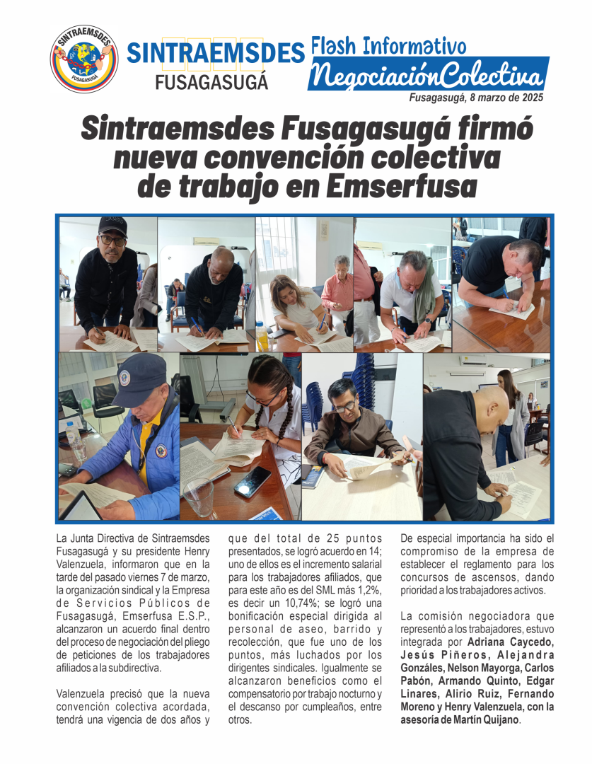 La Junta Directiva de Sintraemsdes Fusagasugá y su presidente Henry Valenzuela, informaron que en la tarde del pasado viernes 7 de marzo, la organización sindical y la Empresa de Servicios Públicos de Fusagasugá, Emserfusa E.S.P., alcanzaron un acuerdo final dentro del proceso de negociación del pliego de peticiones de los trabajadores afiliados a la subdirectiva.