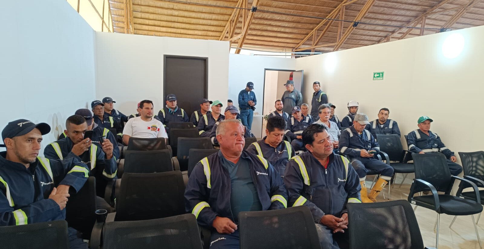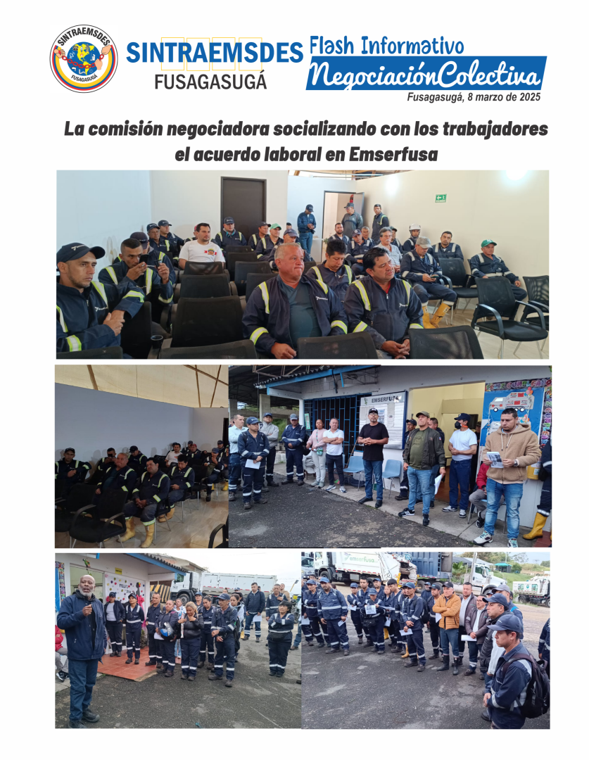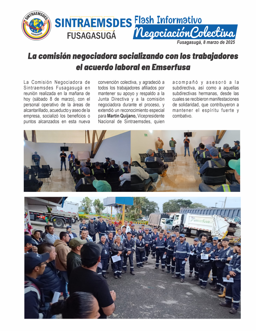 La Comisión Negociadora de Sintraemsdes Fusagasugá en reunión realizada en la mañana de hoy (sábado 8 de marzo), con el personal operativo de la áreas de alcantarillado, acueducto y aseo de la empresa, socializó los beneficios o puntos alcanzados en esta nueva convención colectiva, y agradeció a todos los trabajadores afiliados por mantener su apoyo y respaldo a la Junta Directiva y a la comisión negociadora durante el proceso, y extendió un reconocimiento especial para Martín Quijano, Vicepresidente Nacional de Sintraemsdes, quien acompañó y asesoró a la subdirectiva, así como a aquellas subdirectivas hermanas, desde las cuales se recibieron manifestaciones de solidaridad, que contribuyeron a mantener el espíritu fuerte y combativo.