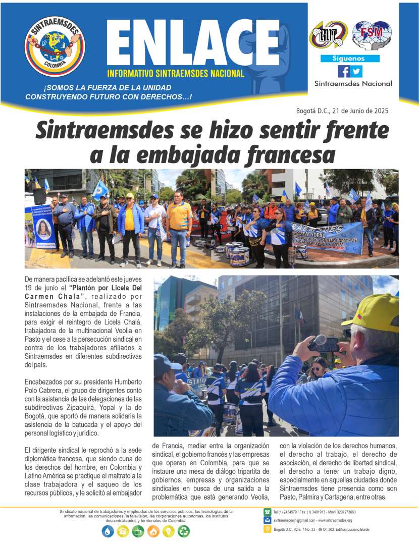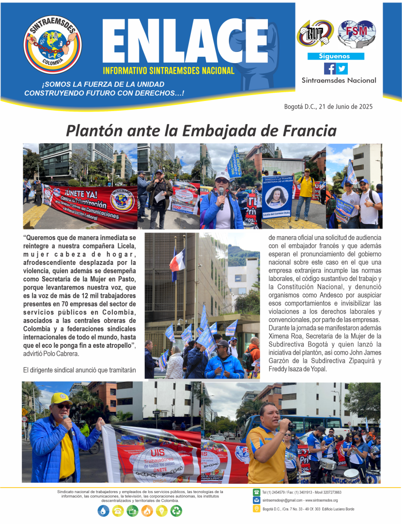 De manera pacífica se adelantó este jueves 19 de junio el “Plantón por Licela Del Carmen Chala”, realizado por Sintraemsdes Nacional, frente a las instalaciones de la embajada de Francia, para exigir el reintegro de Licela Chalá, trabajadora de la multinacional Veolia en Pasto y el cese a la persecución sindical en contra de los trabajadores afiliados a Sintraemsdes en diferentes subdirectivas del país.
