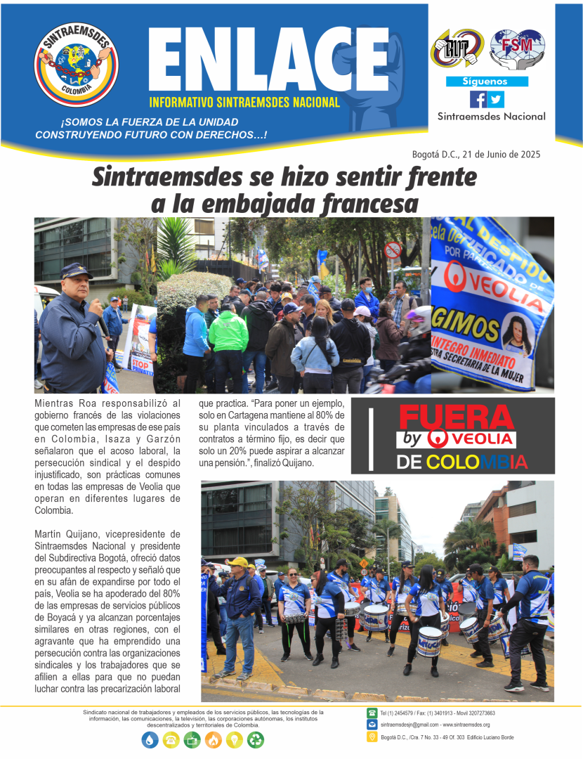 Martín Quijano, vicepresidente de Sintraemsdes Nacional y presidente del Subdirectiva Bogotá, ofreció datos preocupantes al respecto y señaló que en su afán de expandirse por todo el país, Veolia se ha apoderado del 80% de las empresas de servicios públicos de Boyacá y ya alcanzan porcentajes similares en otras regiones, con el agravante que ha emprendido una persecución contra las organizaciones sindicales y los trabajadores que se afilien a ellas para que no puedan luchar contra las precarización laboral que practica. “Para poner un ejemplo, solo en Cartagena mantiene al 80% de su planta vinculados a través de contratos a término fijo, es decir que solo un 20% puede aspirar a alcanzar una pensión.”, finalizó Quijano.