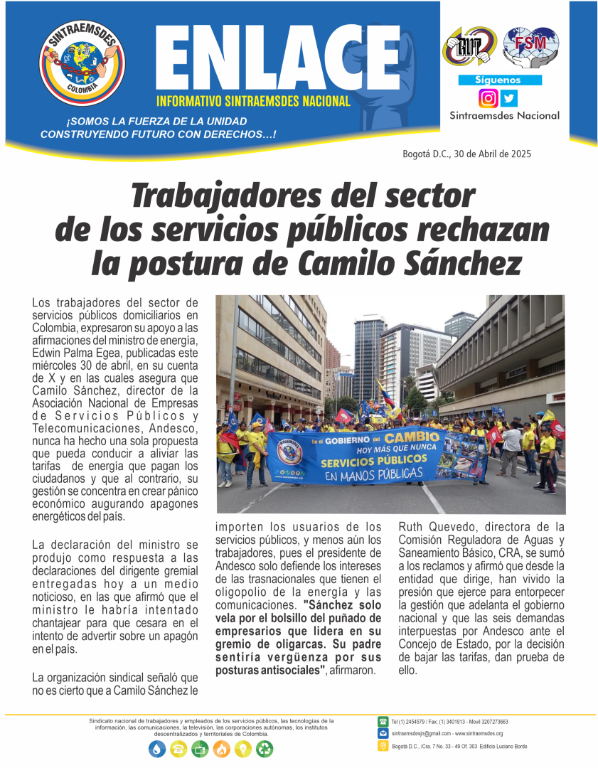 Los trabajadores del sector de servicios públicos domiciliarios en Colombia, expresaron su apoyo a las afirmaciones del ministro de energía, Edwin Palma Egea, publicadas este miércoles 30 de abril, en su cuenta de X y en las cuales asegura que Camilo Sánchez, director de la Asociación Nacional de Empresas de Servicios Públicos y Telecomunicaciones, Andesco, nunca ha hecho una sola propuesta que pueda conducir a aliviar las tarifas de energía que pagan los ciudadanos y que al contrario, su gestión se concentra en crear pánico económico augurando apagones energéticos del país.