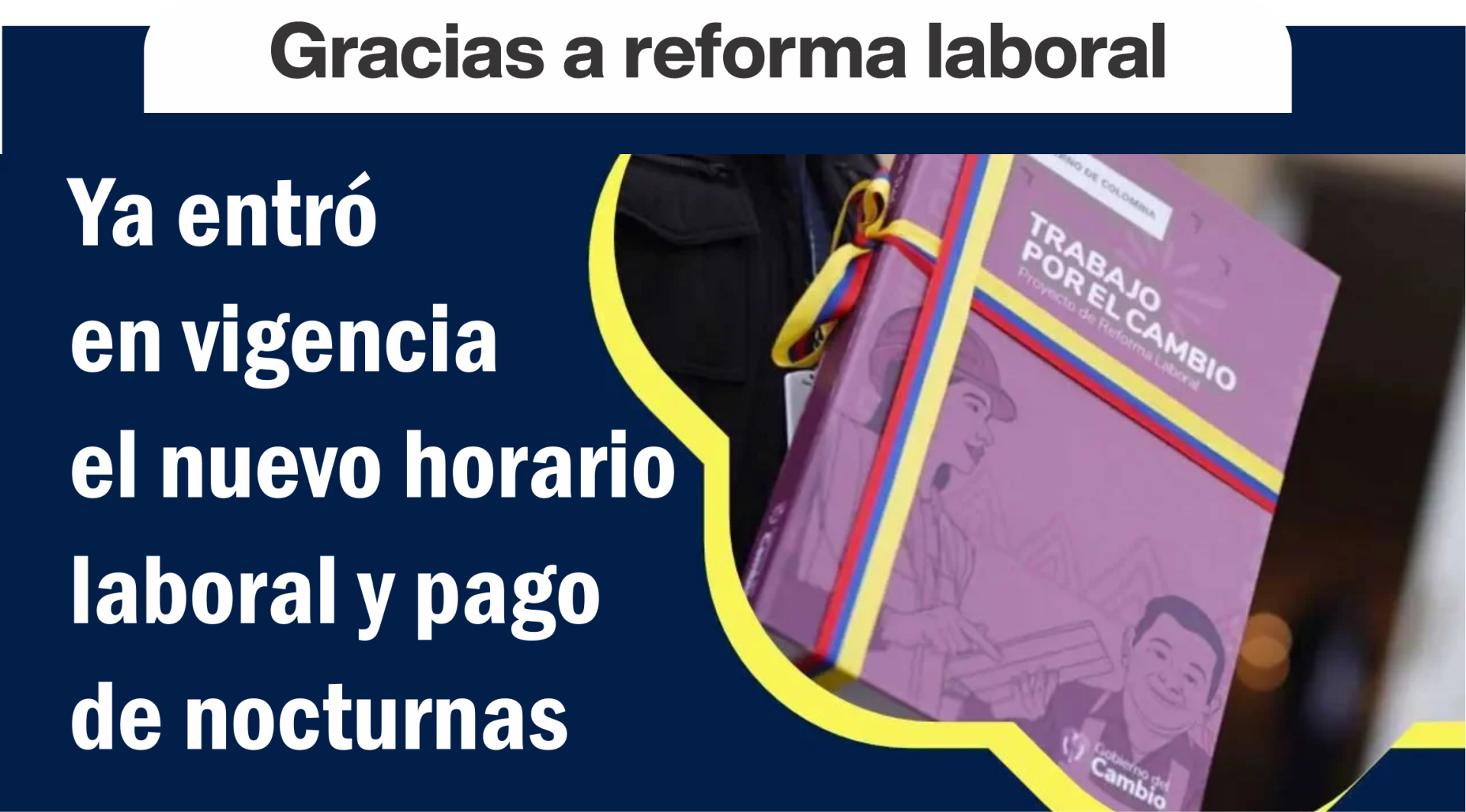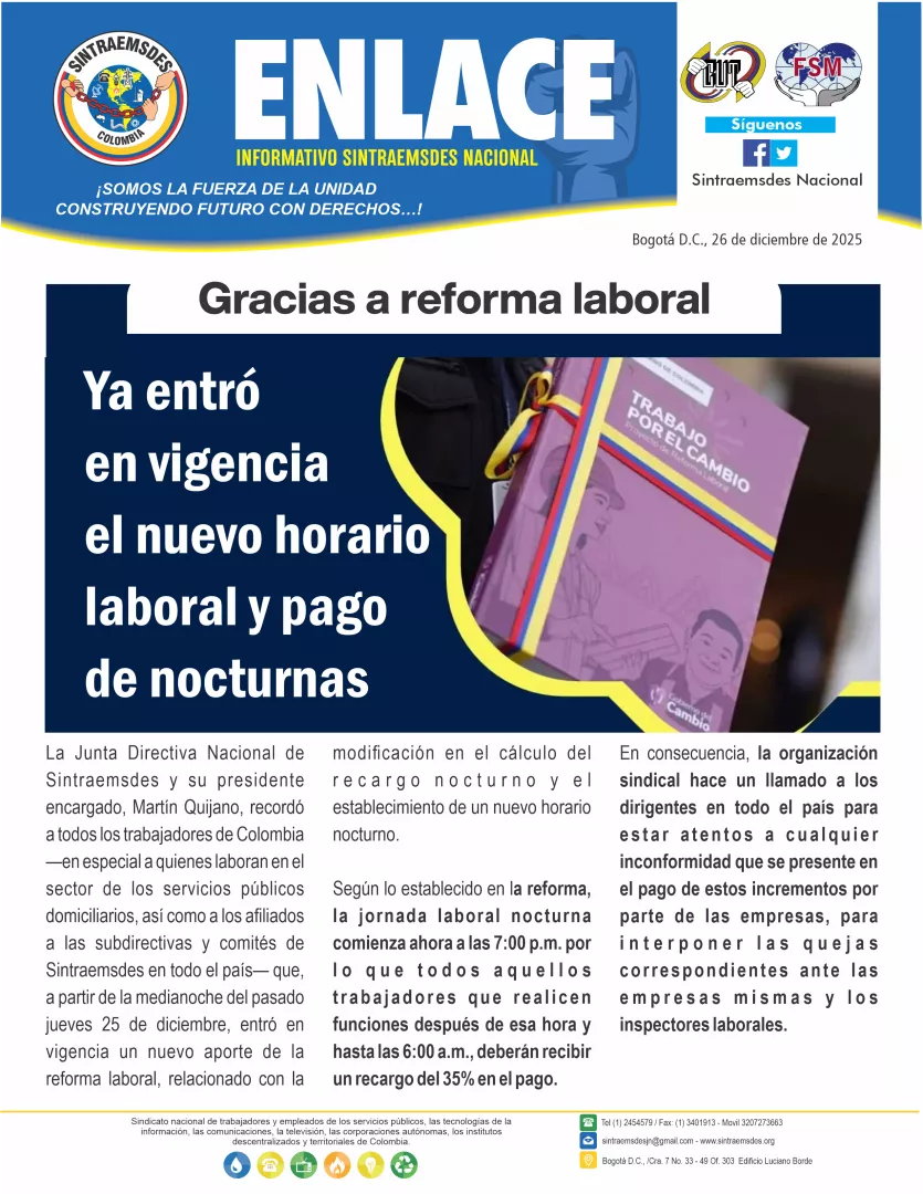 La Junta Directiva Nacional de Sintraemsdes y su presidente encargado, Martín Quijano, recordó a todos los trabajadores de Colombia —en especial a quienes laboran en el sector de los servicios públicos domiciliarios, así como a los afiliados a las subdirectivas y comités de Sintraemsdes en todo el país— que, a partir de la medianoche del pasado jueves 25 de diciembre, entró en vigencia un nuevo aporte de la reforma laboral, relacionado con la modificación en el cálculo del recargo nocturno y el establecimiento de un nuevo horario nocturno.