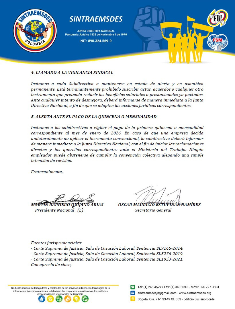 Hacemos un llamado a la calma y a la firmeza. El incremento salarial decretado por el Gobierno Nacional, sumado a los puntos convencionales pactados, es una conquista legítima que debe respetarse. Bajo ninguna circunstancia, las juntas directivas de las subdirectivas están facultadas para revisar, renegociar, ceder o firmar actas extraconvencionales que impliquen una regresividad en los derechos ya adquiridos. Lo pactado, pactado está.