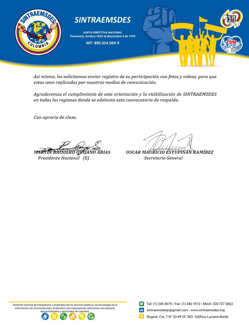 Agradecemos el cumplimiento de esta orientación y la visibilización de SINTRAEMSDES en todas las regiones donde se adelanta esta convocatoria de respaldo.