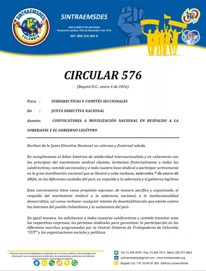 En cumplimiento al deber histórico de solidaridad internacionalista y en coherencia con los principios del movimiento sindical clasista, invitamos fraternalmente a todas las subdirectivas, comités seccionales y a toda nuestra base sindical a participar activamente en la gran movilización nacional que se llevará a cabo mañana, miércoles 7 de enero de 2026, en las diferentes ciudades del país, en respaldo a la soberanía y el gobierno legítimo.