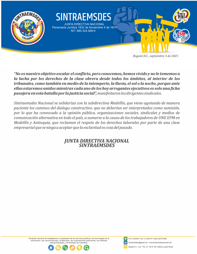 Sintraemsdes Nacional se solidariza con la subdirectiva Medellín, que viene agotando de manera paciente los caminos del dialogo constructivo, que no deberían ser interpretados como sumisión, por lo que ha convocado a la opinión pública, organizaciones sociales, sindicales y medios de comunicación alternativa en todo el país, a sumarse a la causa de los trabajadores de UNE EPM en Medellín y Antioquia, que reclaman el respeto de los derechos laborales por parte de una clase empresarial que se niega a aceptar que la esclavitud es cosa del pasado.