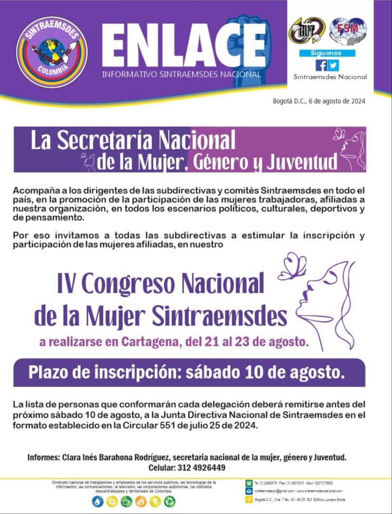 Informes: Clara Inés Barahona Rodríguez, secretaria nacional de la mujer, género y Juventud. Celular: 312 4926449