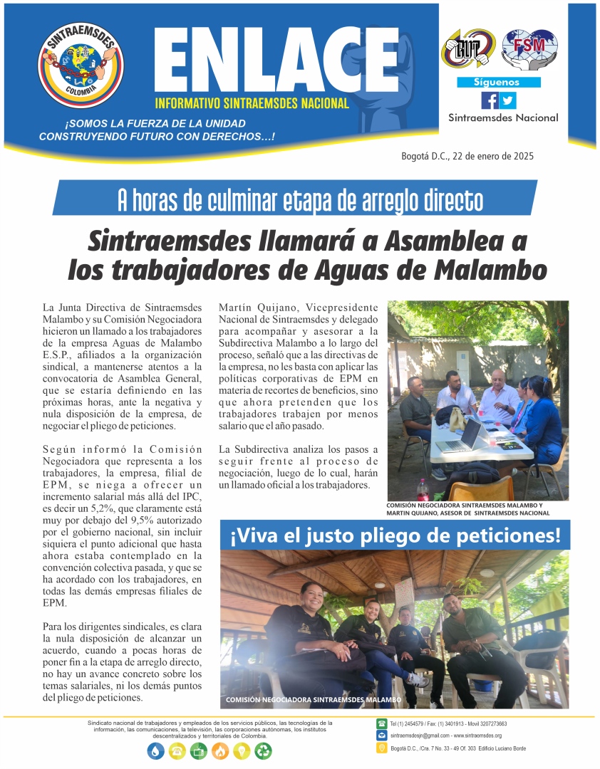 La Junta Directiva de Sintraemsdes Malambo y su Comisión Negociadora hicieron un llamado a los trabajadores de la empresa Aguas de Malambo E.S.P., afiliados a la organización sindical, a mantenerse atentos a la convocatoria de Asamblea General, que se estaría definiendo en las próximas horas, ante la negativa y nula disposición de la empresa, de negociar el pliego de peticiones.
