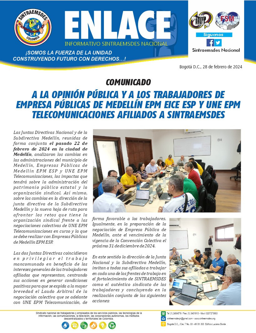 Las Juntas Directivas Nacional y de la Subdirectiva Medellín, reunidas de forma conjunta el pasado 22 de febrero de 2024 en la ciudad de Medellín, analizaron los cambios en las administraciones del municipio de Medellín, Empresas Públicas de Medellín EPM ESP y UNE EPM Telecomunicaciones, los impactos que tendrá sobre la administración del patrimonio público estatal y la organización sindical. Así mismo, sobre los cambios en la dirección de la junta directiva de la Subdirectiva Medellín y la nueva hoja de ruta para afrontar los retos que tiene la organización sindical frente a las negociaciones colectivas de UNE EPM Telecomunicaciones en curso y la que se debe realizar con Empresas Públicas de Medellín EPM ESP.