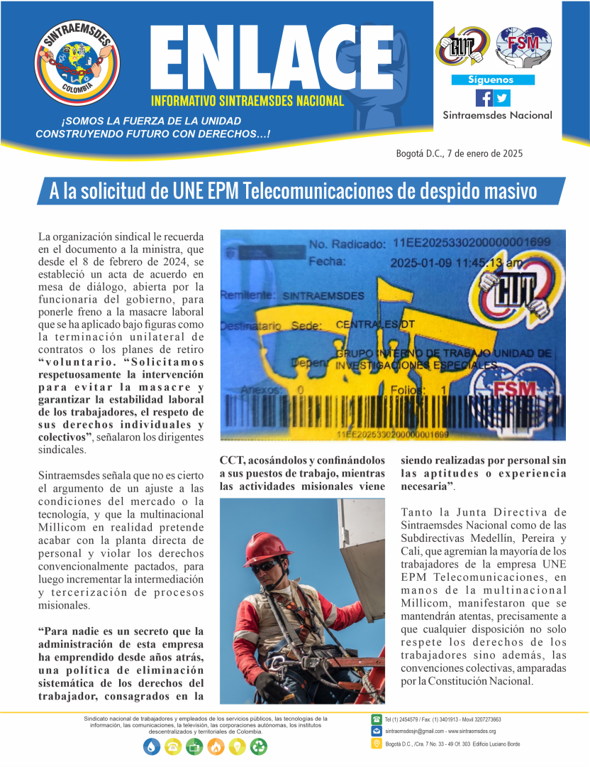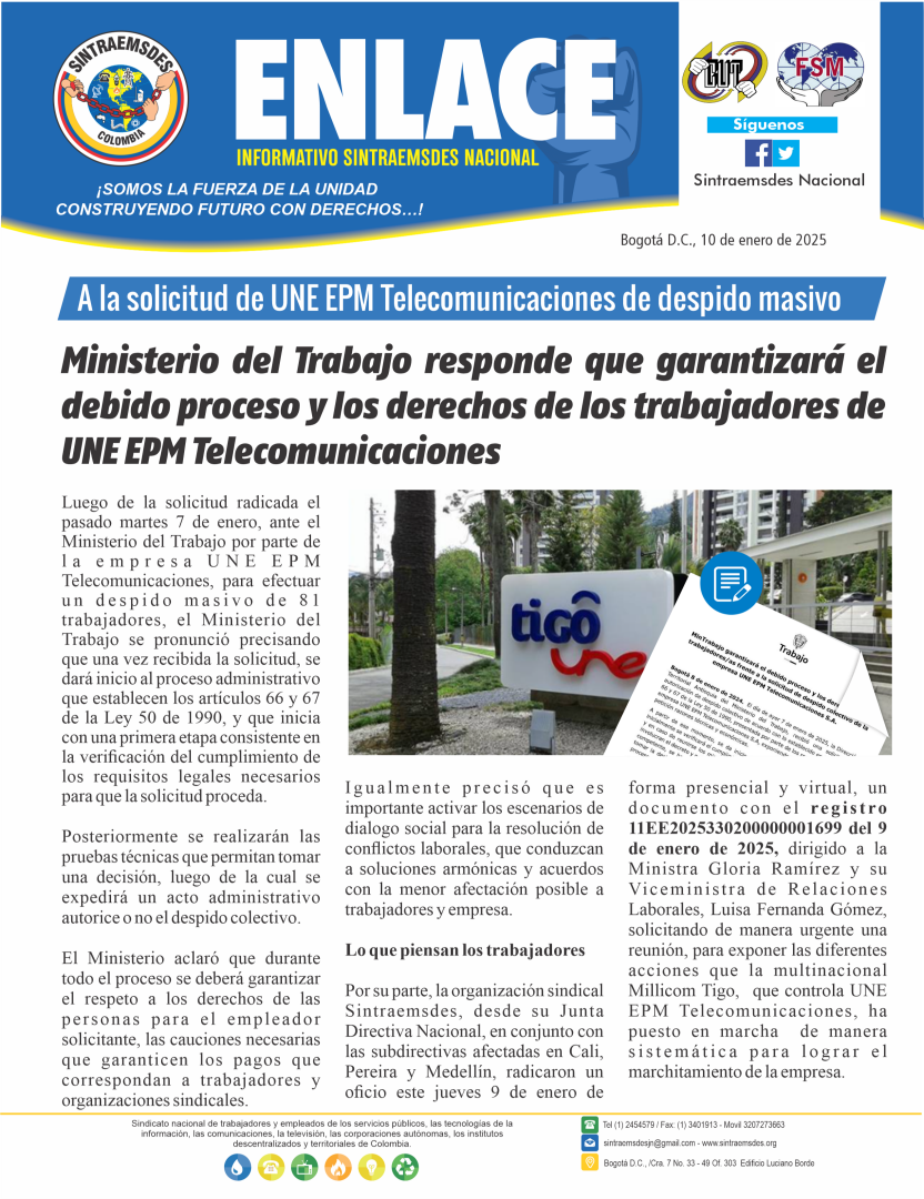 Por su parte, la organización sindical Sintraemsdes, desde su Junta Directiva Nacional, en conjunto con las subdirectivas afectadas en Cali, Pereira y Medellín, radicaron un oficio este jueves 9 de enero de forma presencial y virtual, un documento con el registro 11EE2025330200000001699 del 9 de enero de 2025, dirigido a la Ministra Gloria Ramírez y su Viceministra de Relaciones Laborales, Luisa Fernanda Gómez, solicitando de manera urgente una reunión, para exponer las diferentes acciones que la multinacional Millicom Tigo, que controla UNE EPM Telecomunicaciones, ha puesto en marcha de manera sistemática para lograr el marchitamiento de la empresa.