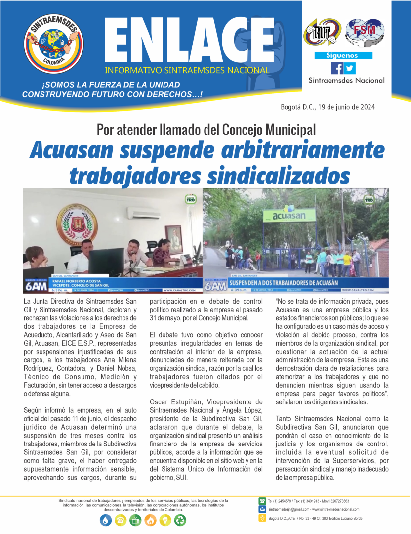 La Junta Directiva de Sintraemsdes San Gil y Sintraemsdes Nacional, deploran y rechazan las violaciones a los derechos de dos trabajadores de la Empresa de Acueducto, Alcantarillado y Aseo de San Gil, Acuasan, EICE E.S.P., representadas por suspensiones injustificadas de sus cargos, a los trabajadores Ana Milena Rodríguez, Contadora, y Daniel Nobsa, Técnico de Consumo, Medición y Facturación, sin tener acceso a descargos o defensa alguna.