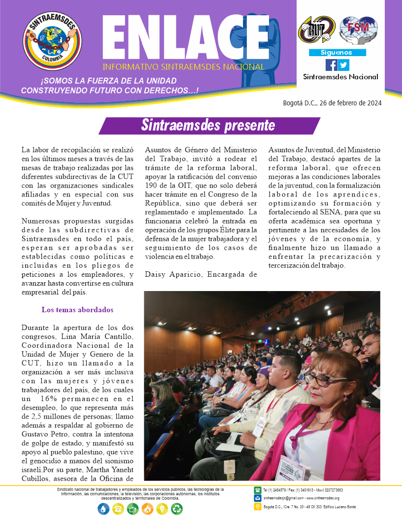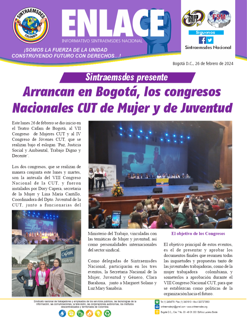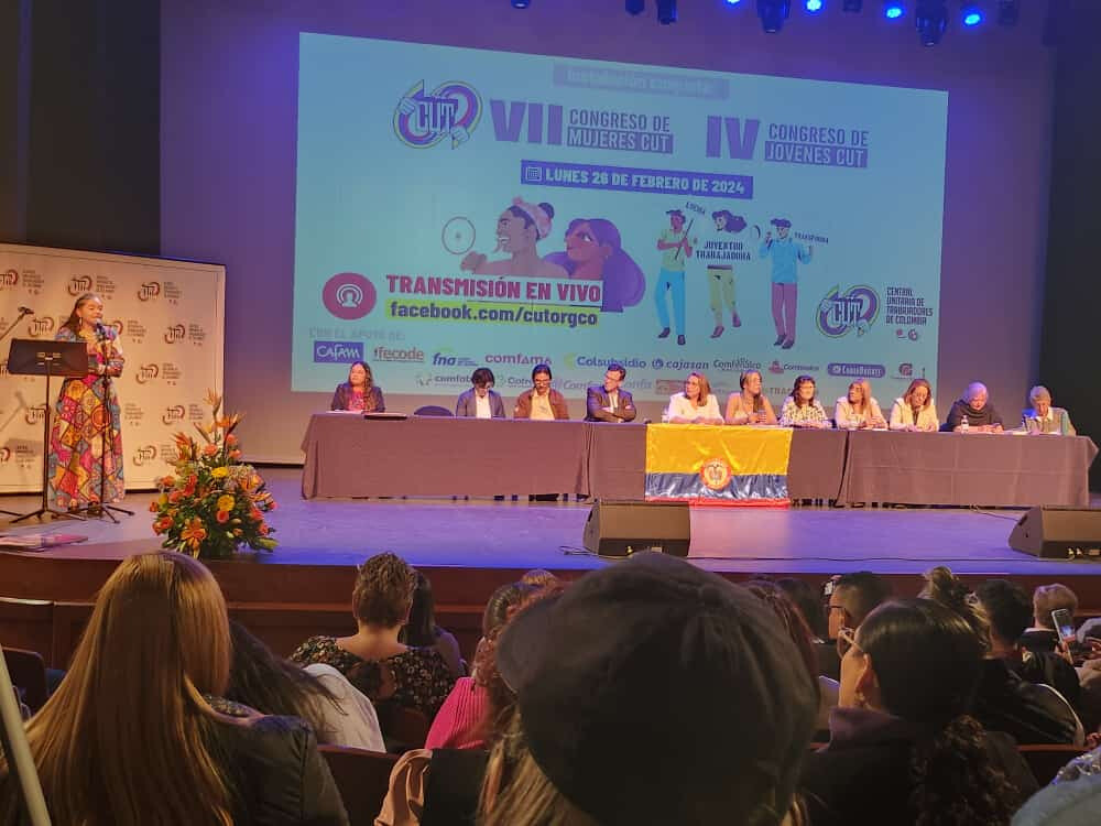 Este lunes 26 de febrero se dio inicio en el Teatro Cafam de Bogotá, al VII Congreso de Mujeres CUT y al IV Congreso de Jóvenes CUT, que se realizan bajo el eslogan ¨Paz, Justicia Social y Ambiental, Trabajo Digno y Decente¨.