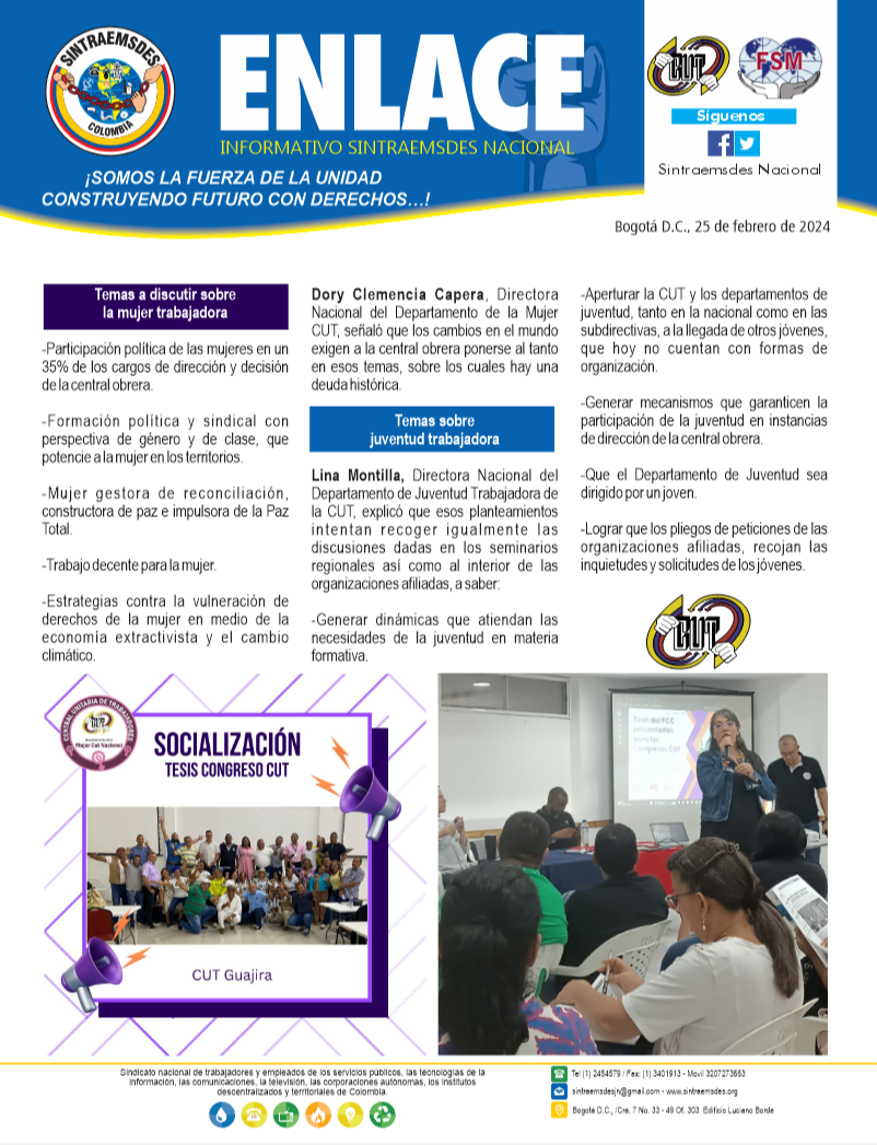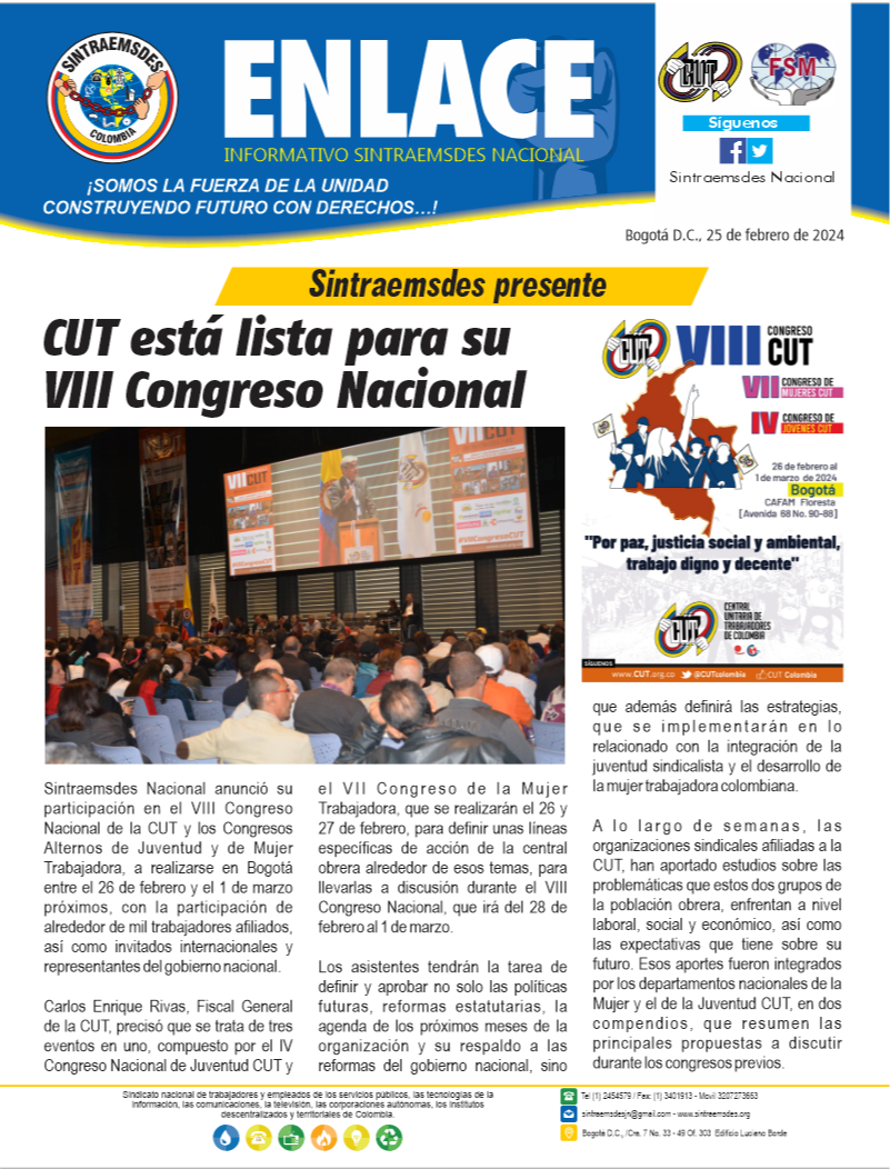 Sintraemsdes Nacional anunció su participación en el VIII Congreso Nacional de la CUT y los Congresos Alternos de Juventud y de Mujer Trabajadora, a realizarse en Bogotá entre el 26 de febrero y el 1 de marzo próximos, con la participación de alrededor de mil trabajadores afiliados, así como invitados internacionales y representantes del gobierno nacional.