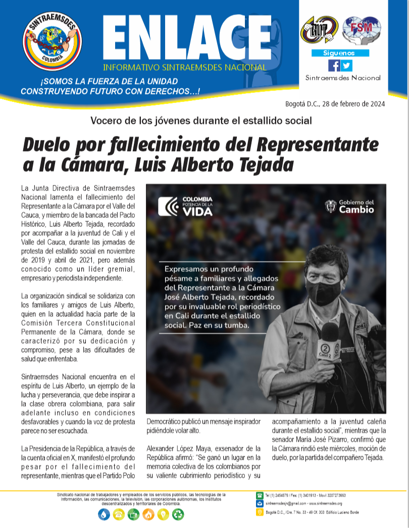 La Junta Directiva de Sintraemsdes Nacional lamenta el fallecimiento del Representante a la Cámara por el Valle del Cauca, y miembro de la bancada del Pacto Histórico, Luis Alberto Tejada, recordado por acompañar a la juventud de Cali y el Valle del Cauca, durante las jornadas de protesta del estallido social en noviembre de 2019 y abril de 2021, pero además conocido como un líder gremial, empresario y periodista independiente.