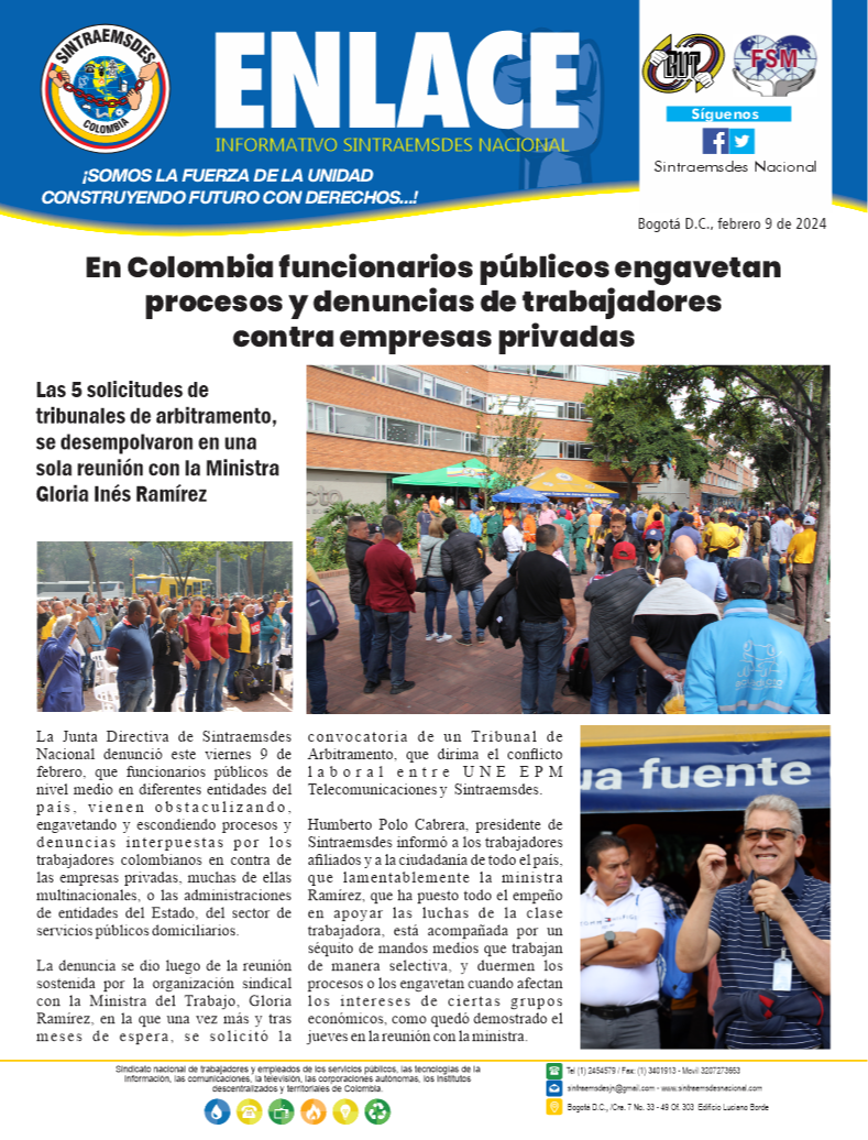 La Junta Directiva de Sintraemsdes Nacional denunció este viernes 9 de febrero, que funcionarios públicos de nivel medio en diferentes entidades del país, vienen obstaculizando, engavetando y escondiendo procesos y denuncias interpuestas por los trabajadores colombianos en contra de las empresas privadas, muchas de ellas multinacionales, o las administraciones de entidades del Estado, del sector de servicios públicos domiciliarios.