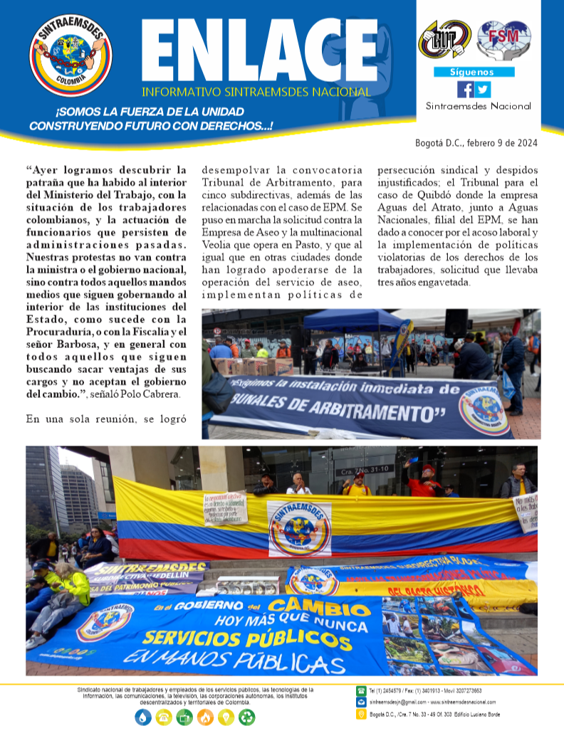En una sola reunión, se logró desempolvar la convocatoria Tribunal de Arbitramento, para cinco subdirectivas, además de las relacionadas con el caso de EPM. Se puso en marcha la solicitud contra la Empresa de Aseo y la multinacional Veolia que opera en Pasto, y que al igual que en otras ciudades donde han logrado apoderarse de la operación del servicio de aseo, implementan políticas de persecución sindical y despidos injustificados; el Tribunal para el caso de Quibdó donde la empresa Aguas del Atrato, junto a Aguas Nacionales, filial del EPM, se han dado a conocer por el acoso laboral y la implementación de políticas violatorias de los derechos de los trabajadores, solicitud que llevaba tres años engavetada.