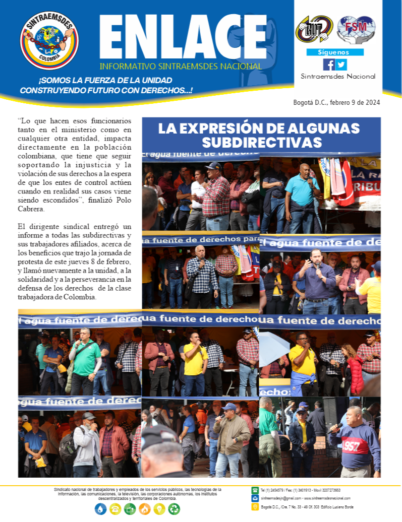 El dirigente sindical entregó un informe a todas las subdirectivas y sus trabajadores afiliados, acerca de los beneficios que trajo la jornada de protesta de este jueves 8 de febrero, y llamó nuevamente a la unidad, a la solidaridad y a la perseverancia en la defensa de los derechos de la clase trabajadora de Colombia.