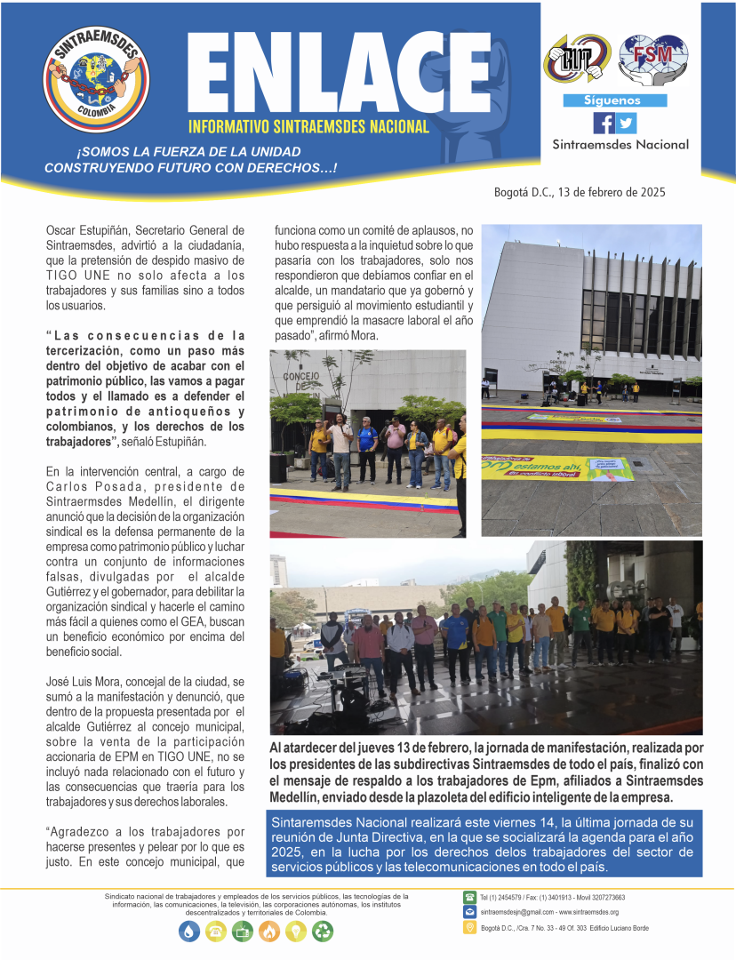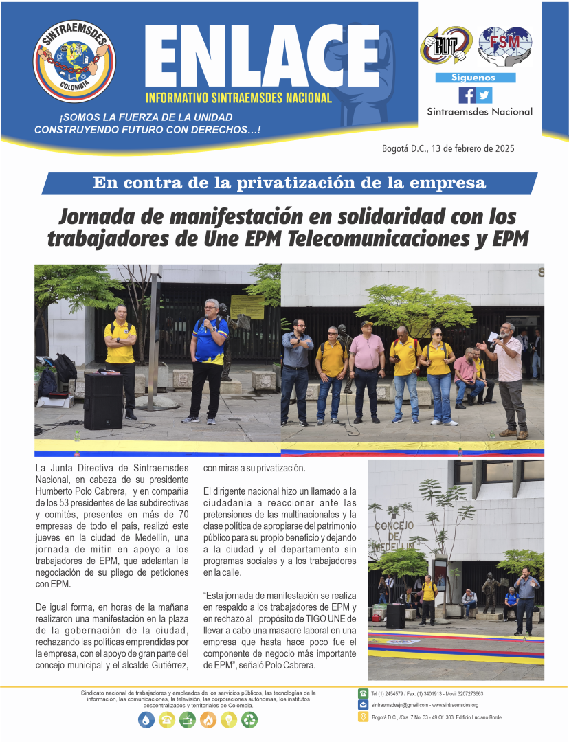 Al atardecer del jueves 13 de febrero, la jornada de manifestación, realizada por los presidentes de las subdirectivas Sintraemsdes de todo el país, finalizó con el mensaje de respaldo a los trabajadores de Epm, afiliados a Sintraemsdes Medellín, enviado desde la plazoleta del edificio inteligente de la empresa.
