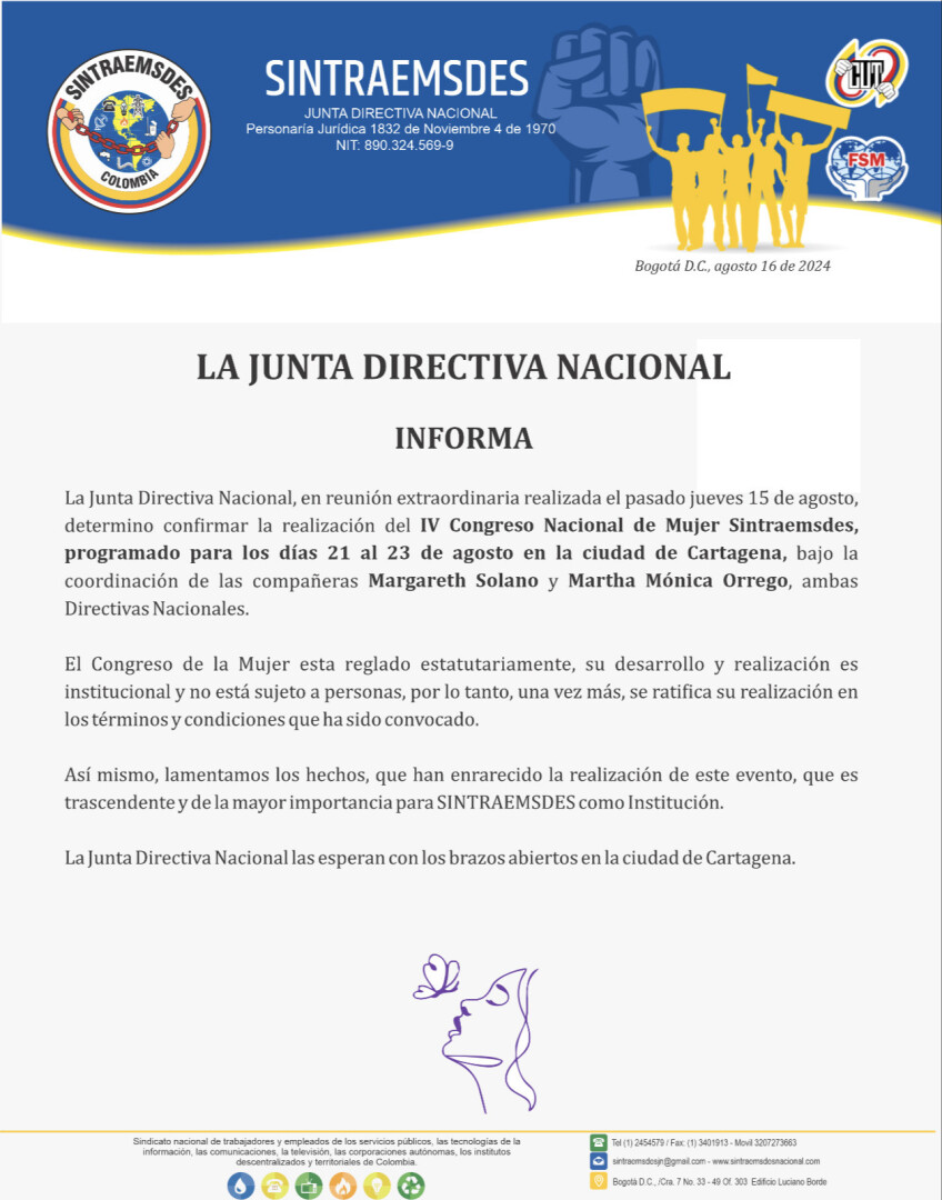 La Junta Directiva Nacional, en reunión extraordinaria realizada el pasado jueves 15 de agosto, determino confirmar la realización del IV Congreso Nacional de Mujer Sintraemsdes, programado para los días 21 al 23 de agosto en la ciudad de Cartagena, bajo la coordinación de las compañeras Margareth Solano y Martha Mónica Orrego, ambas Directivas Nacionales.