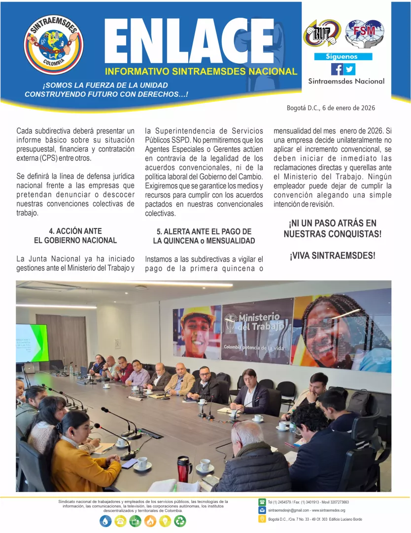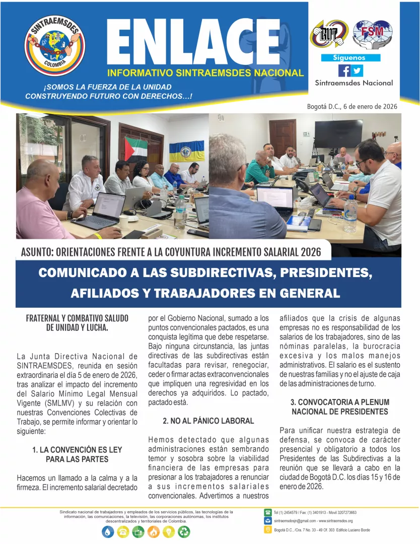 La Junta Directiva Nacional de SINTRAEMSDES, reunida en sesión extraordinaria el día 5 de enero de 2026, tras analizar el impacto del incremento del Salario Mínimo Legal Mensual Vigente (SMLMV) y su relación con nuestras Convenciones Colectivas de Trabajo, se permite informar y orientar lo siguiente: